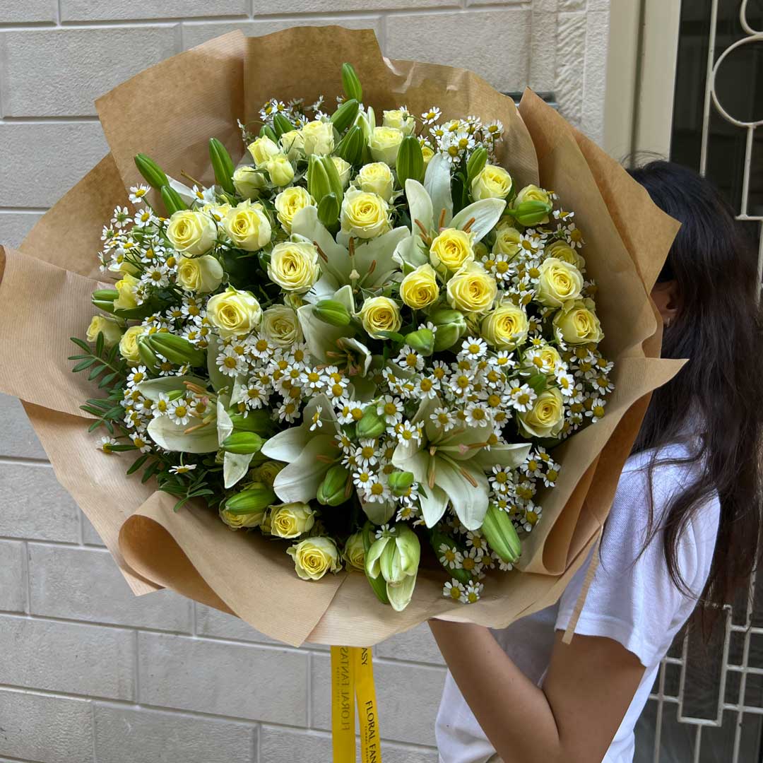 A clean and elegant mix of white flowers, featuring Tanacetum, Lilies White, and Spray Roses Salinero. This bouquet brings tranquility and sophistication, making it a perfect choice for formal events and refined gifts.