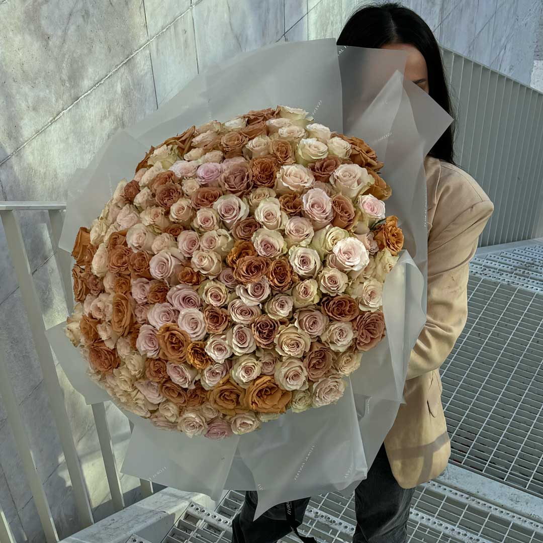 This stunning bouquet, features a rich and warm blend of roses, including the beautiful “Cappuccino” variety with their unique caramel and cream hues, creating a sophisticated and elegant arrangement.