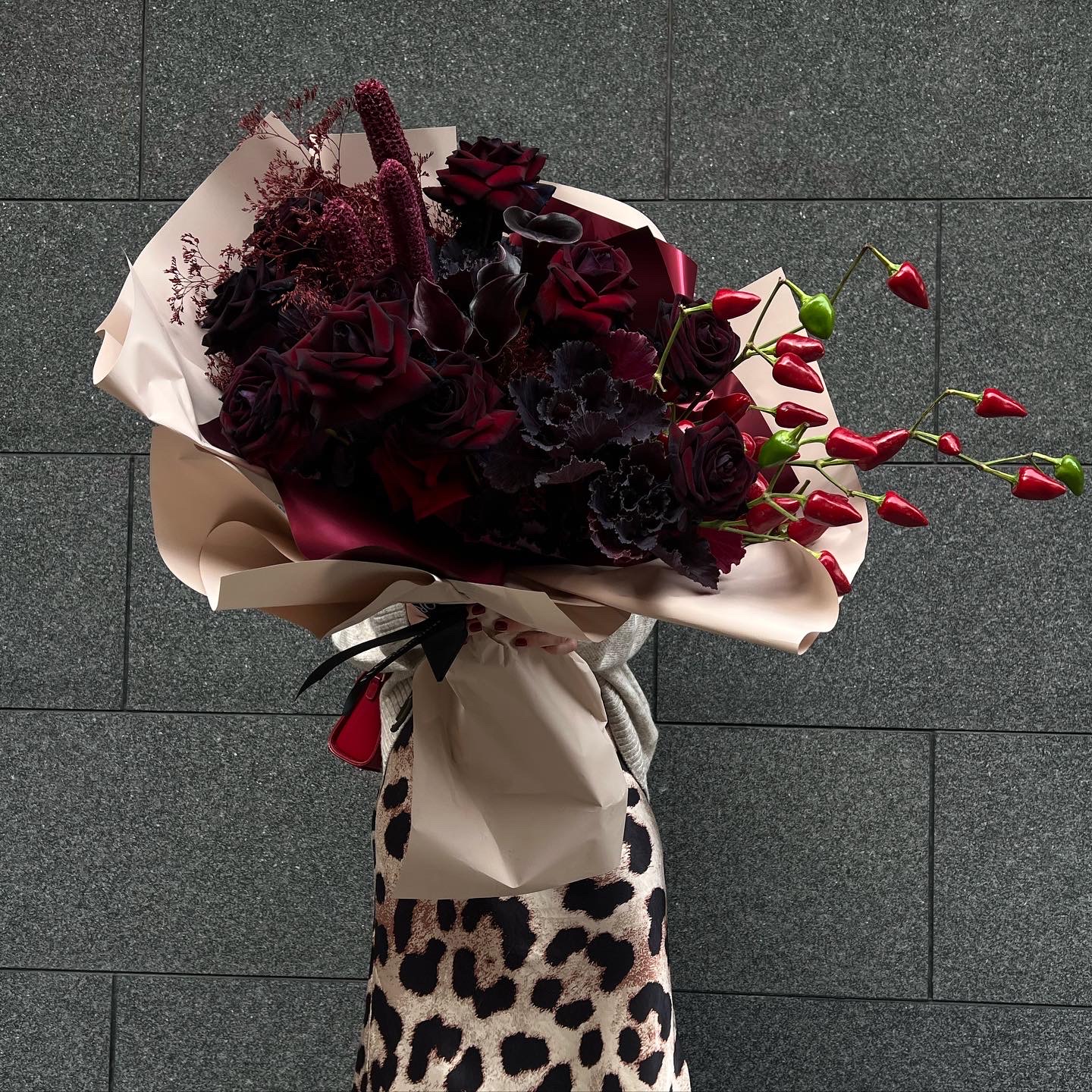 This dramatic bouquet features deep burgundy roses, dark scabiosa, textural foliage, and striking red pepper-like accents, creating a bold and unique display.