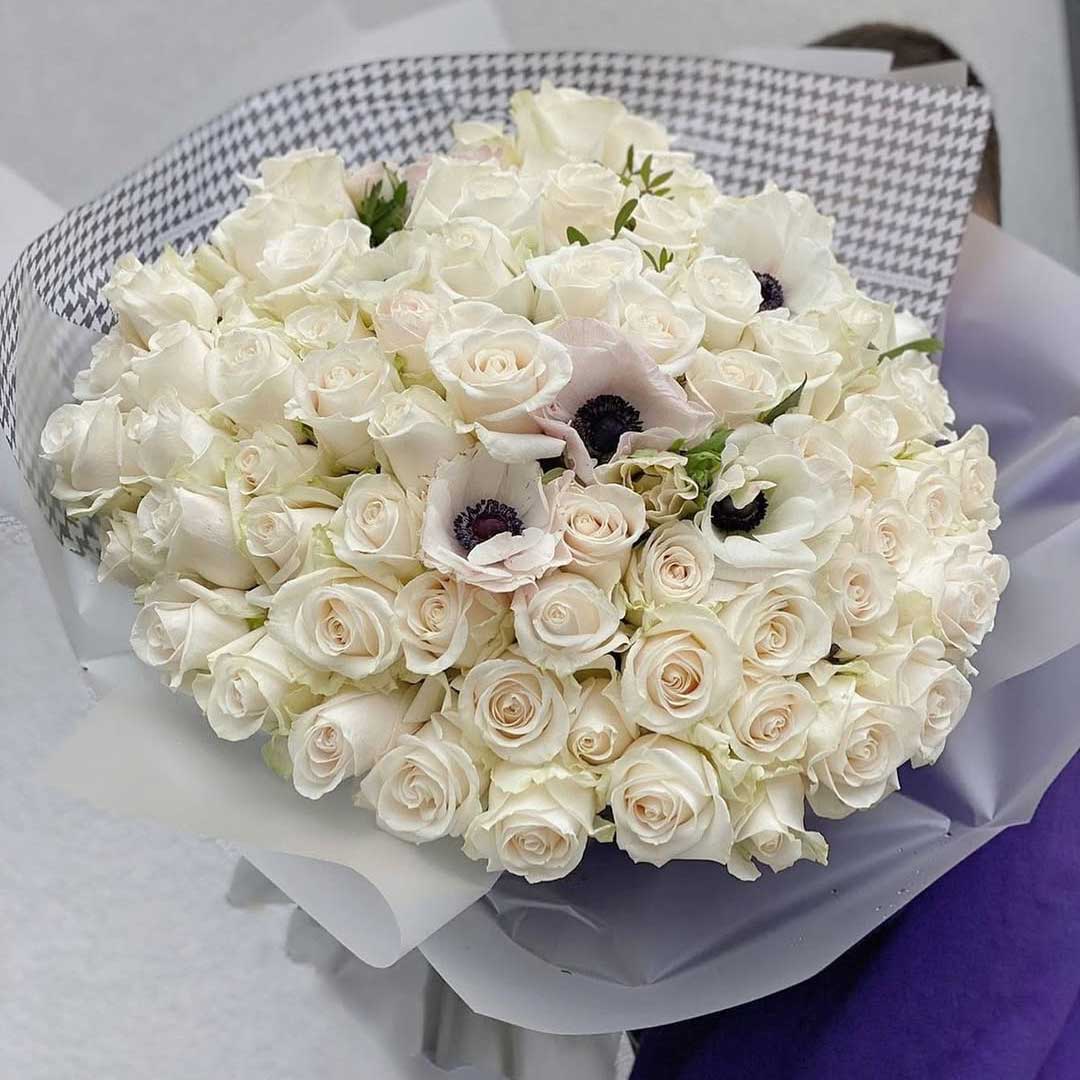 This elegant bouquet features a lush gathering of pristine white garden roses, delicately accented with white anemones featuring striking dark centers, creating a sophisticated and charming display.