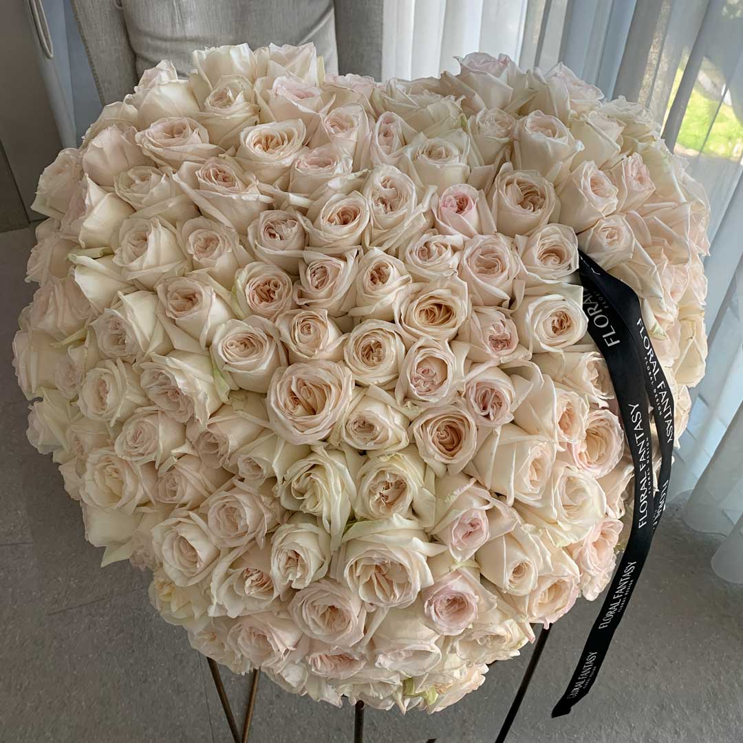 This arrangement features a large heart shape formed with soft and delicate Light Pink Juliet Roses, embodying love and elegance.