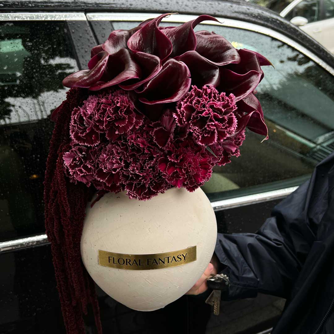 A bold and elegant floral arrangement featuring deep burgundy calla lilies, ruffled carnations, and cascading amaranthus in a minimalist white vase.