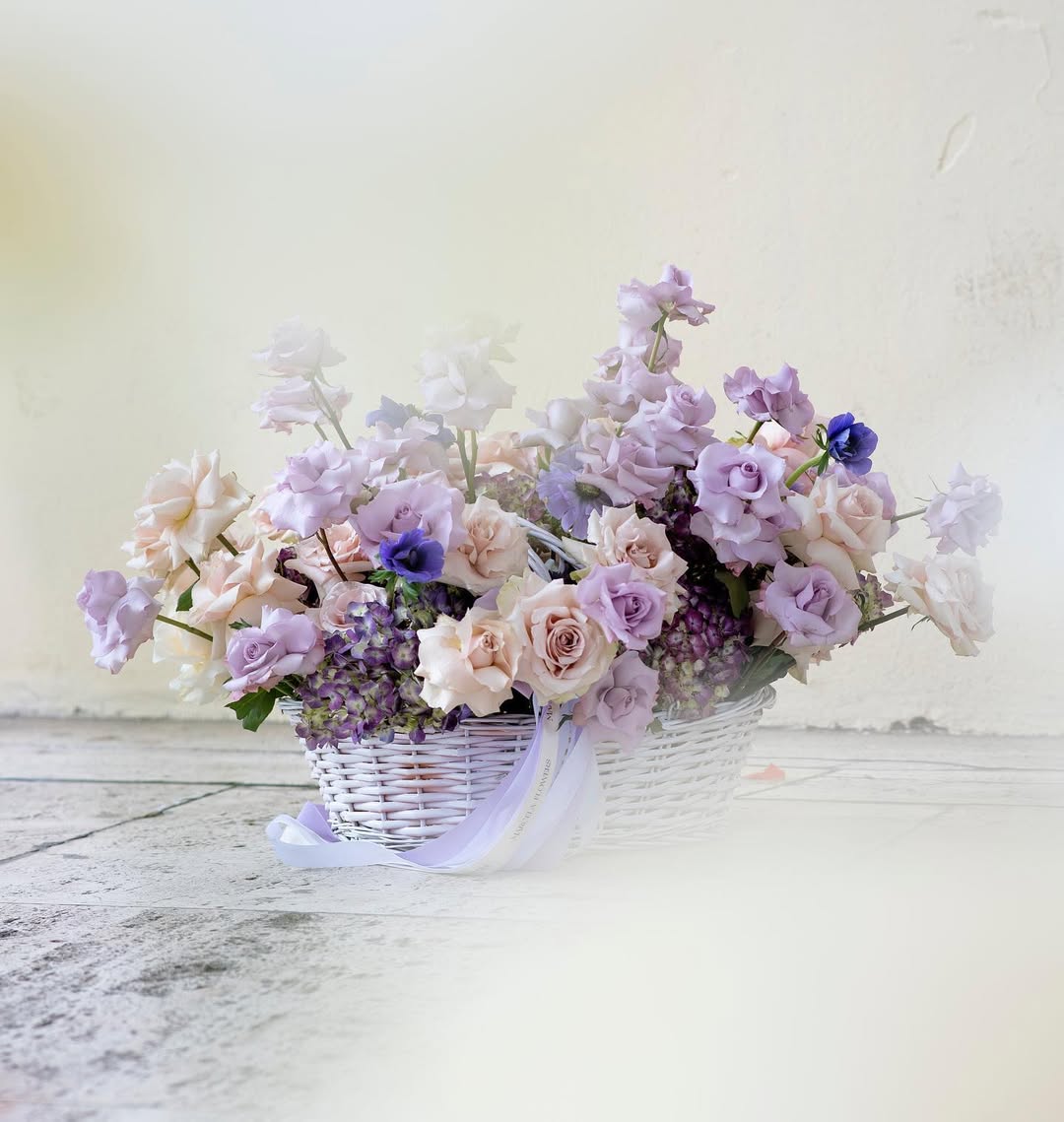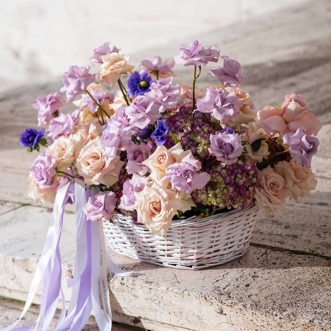 This is a basket arrangement with a beautiful mix of flowers. The composition includes Rosa Ocean Song, Rosa Quick Sand, Anemone, Rosa Faith, and Hydrangea Beauty Berry Super.