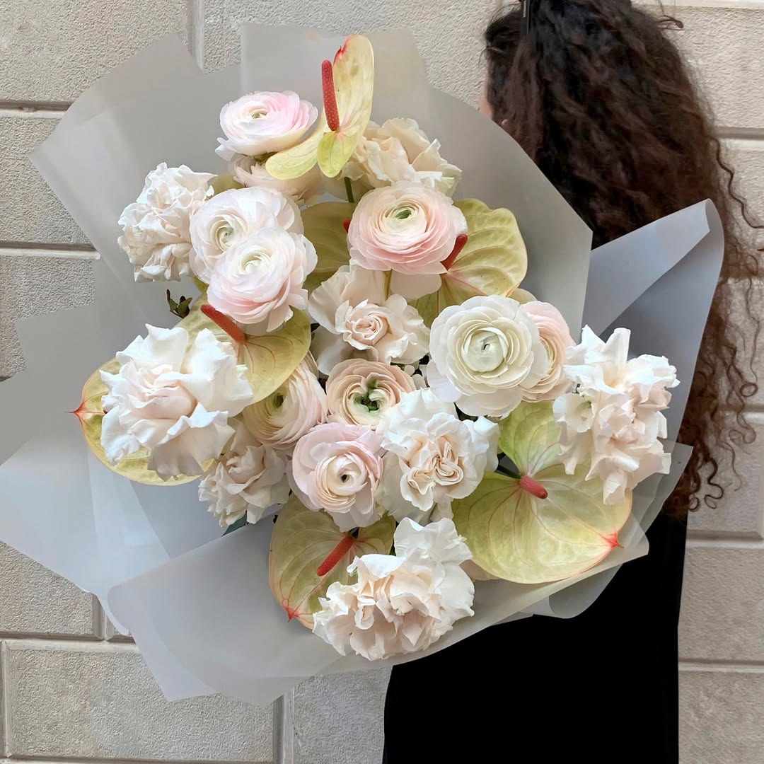 A perfect mix of soft Ranunculi Pastello, elegant Rosa Vendela, and vibrant Anthurium Kaseko, this bouquet offers a delicate yet striking beauty for any occasion.