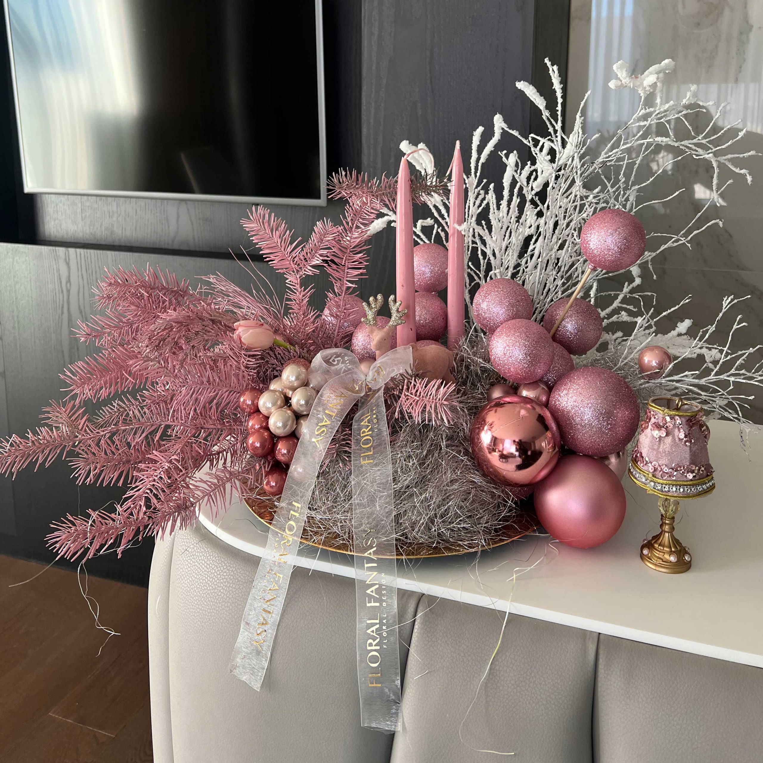 This festive centerpiece, potentially an Advent wreath, features soft pink candles, shimmering pink ornaments, frosted branches, and delicate pink and brown decorative elements, creating a gentle and elegant holiday display.