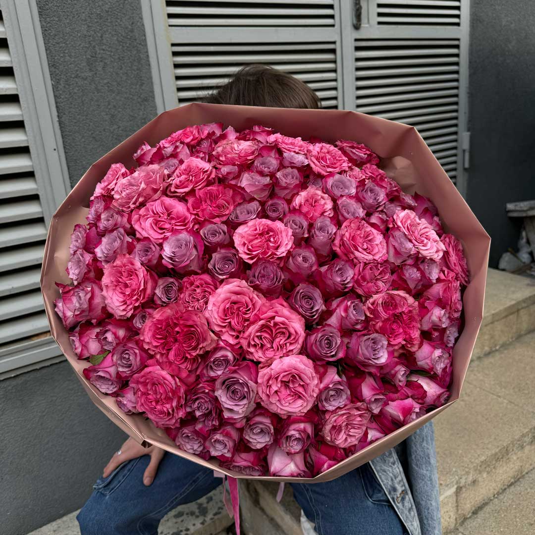 This lavish bouquet showcases a stunning abundance of deep pink and magenta roses, creating a rich and captivating display.