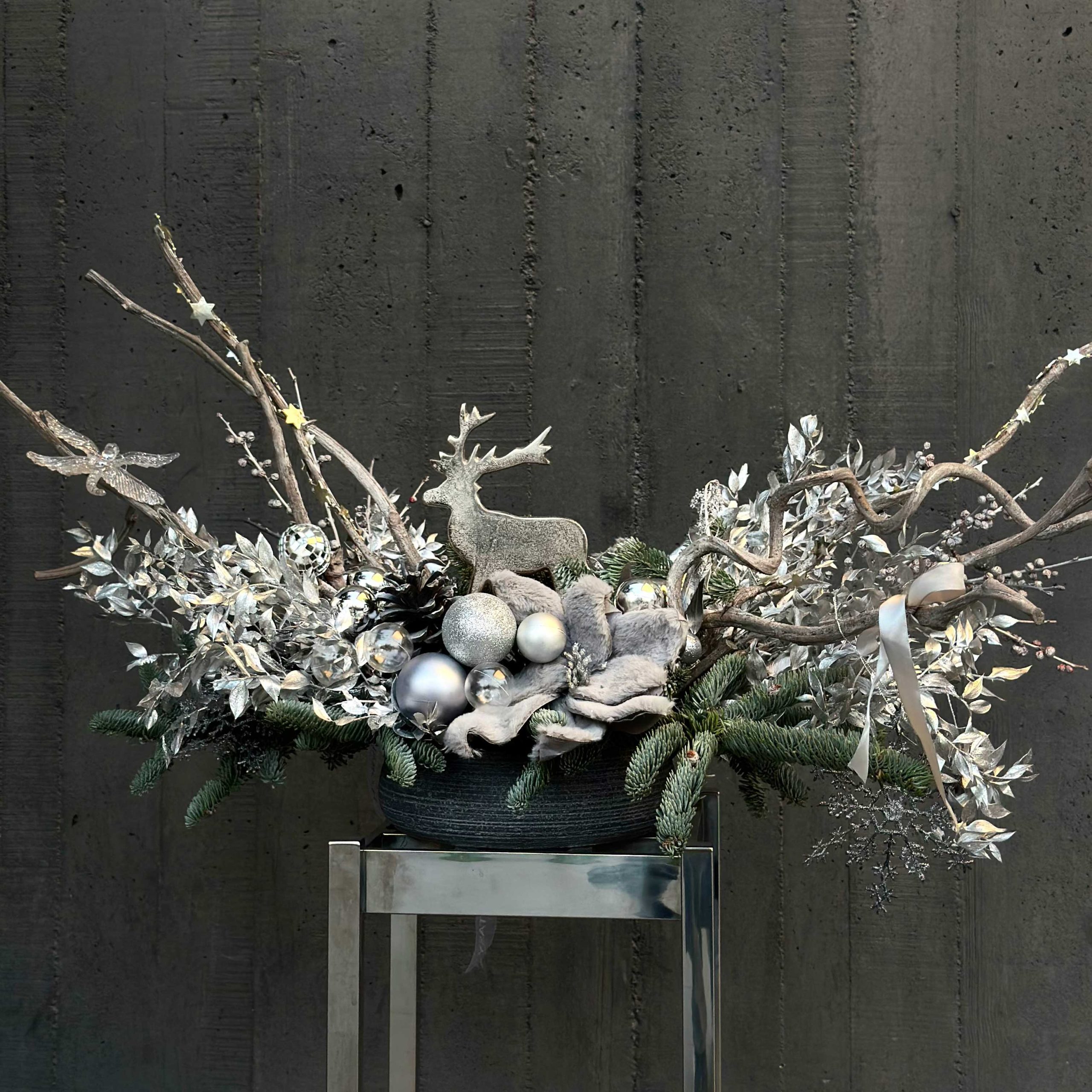 This elegant holiday centerpiece features fresh pine branches, silvered foliage and twigs, shimmering silver ornaments, pinecones, and a decorative silver reindeer, creating a sophisticated winter scene.