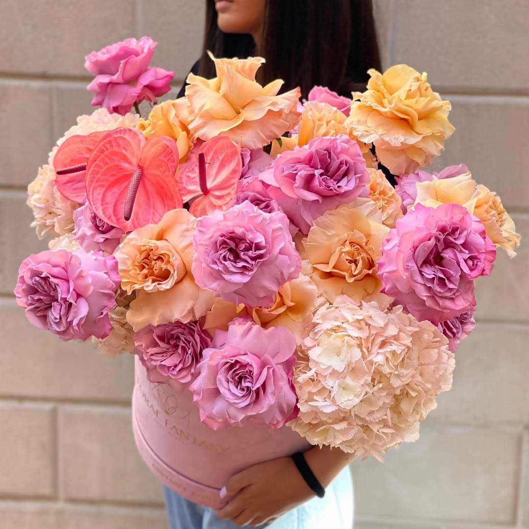 This is a floral arrangement with a delicate mix of blooms. The composition includes Rosa Shimer, Rosa Country Blues, Anthurium Hydrangea, and Light Pink Anthurium Candy.