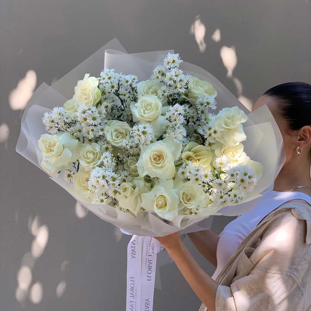 A refined combination that unites the radiance and delicacy of flowers. The bouquet features Aster Fosa, with its light petals and elegant form symbolizing kindness and resilience, and White Athena, a pure and graceful flower representing brightness and tranquility.