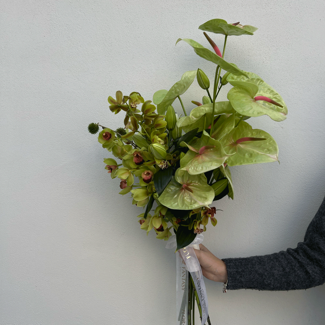 This striking bouquet features lime green anthuriums and green cymbidium orchids
