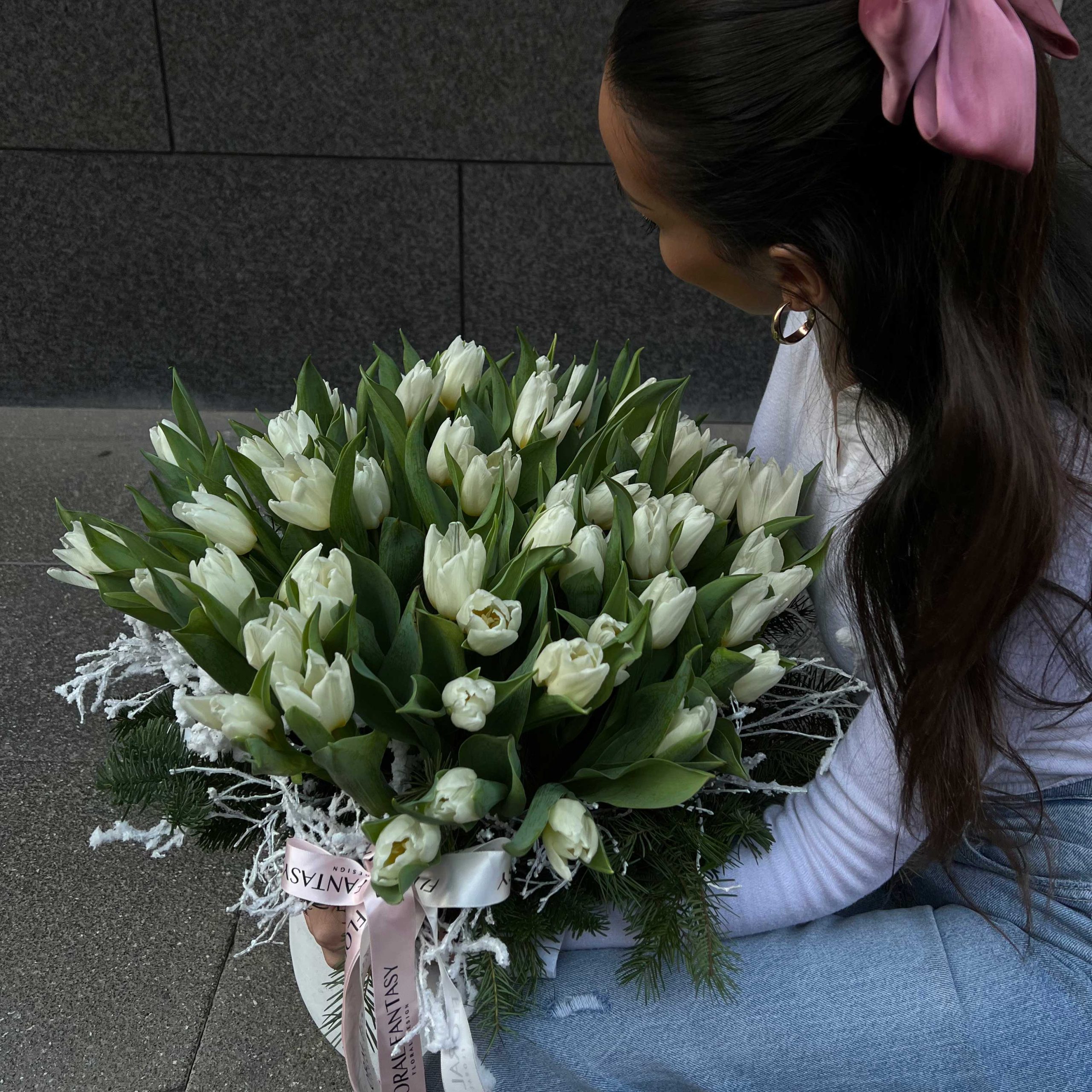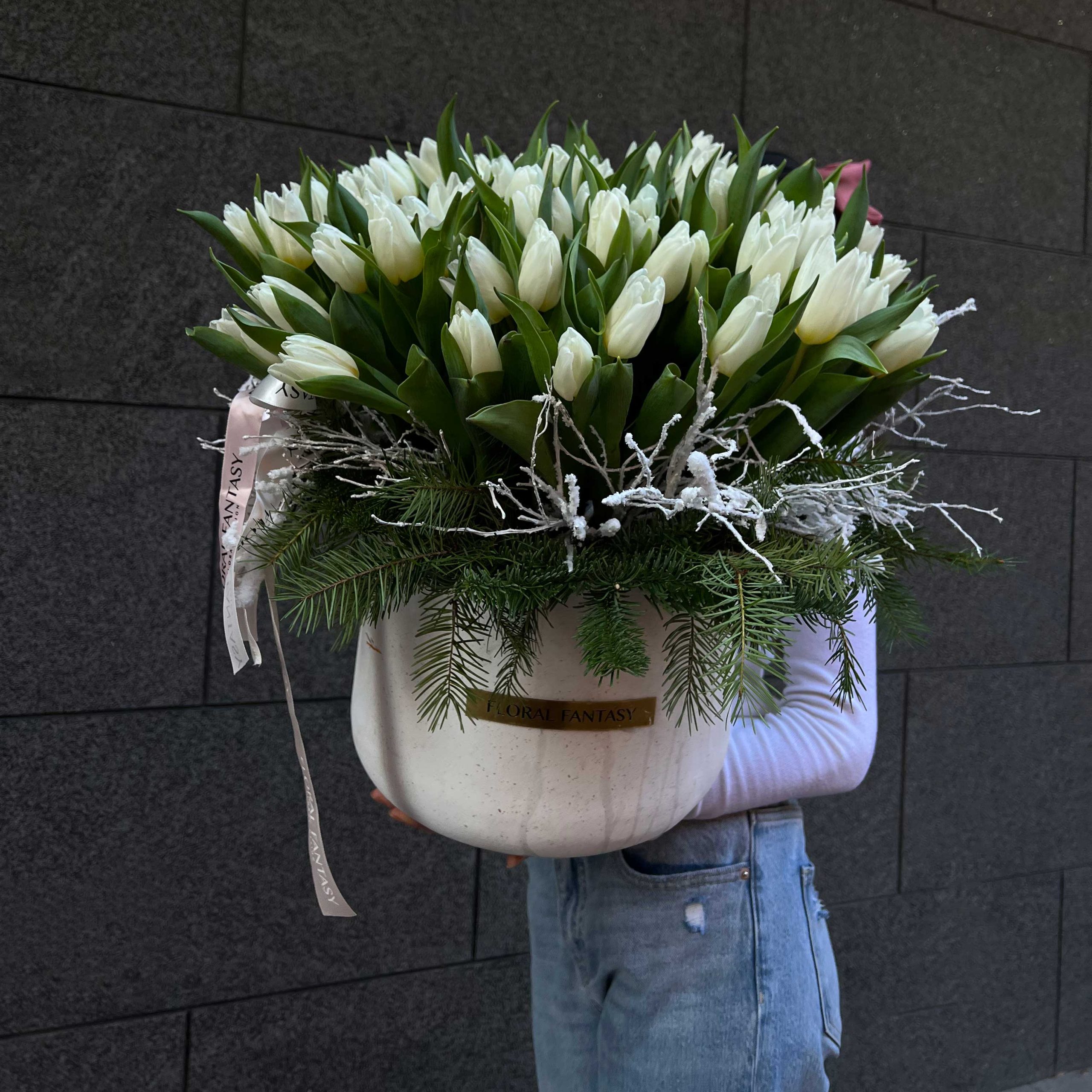 This beautiful arrangement features a generous bouquet of pristine white tulips, possibly accented with delicate frosted foliage, presented in a stylish container with elegant ribbons.