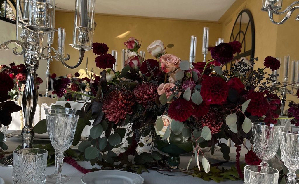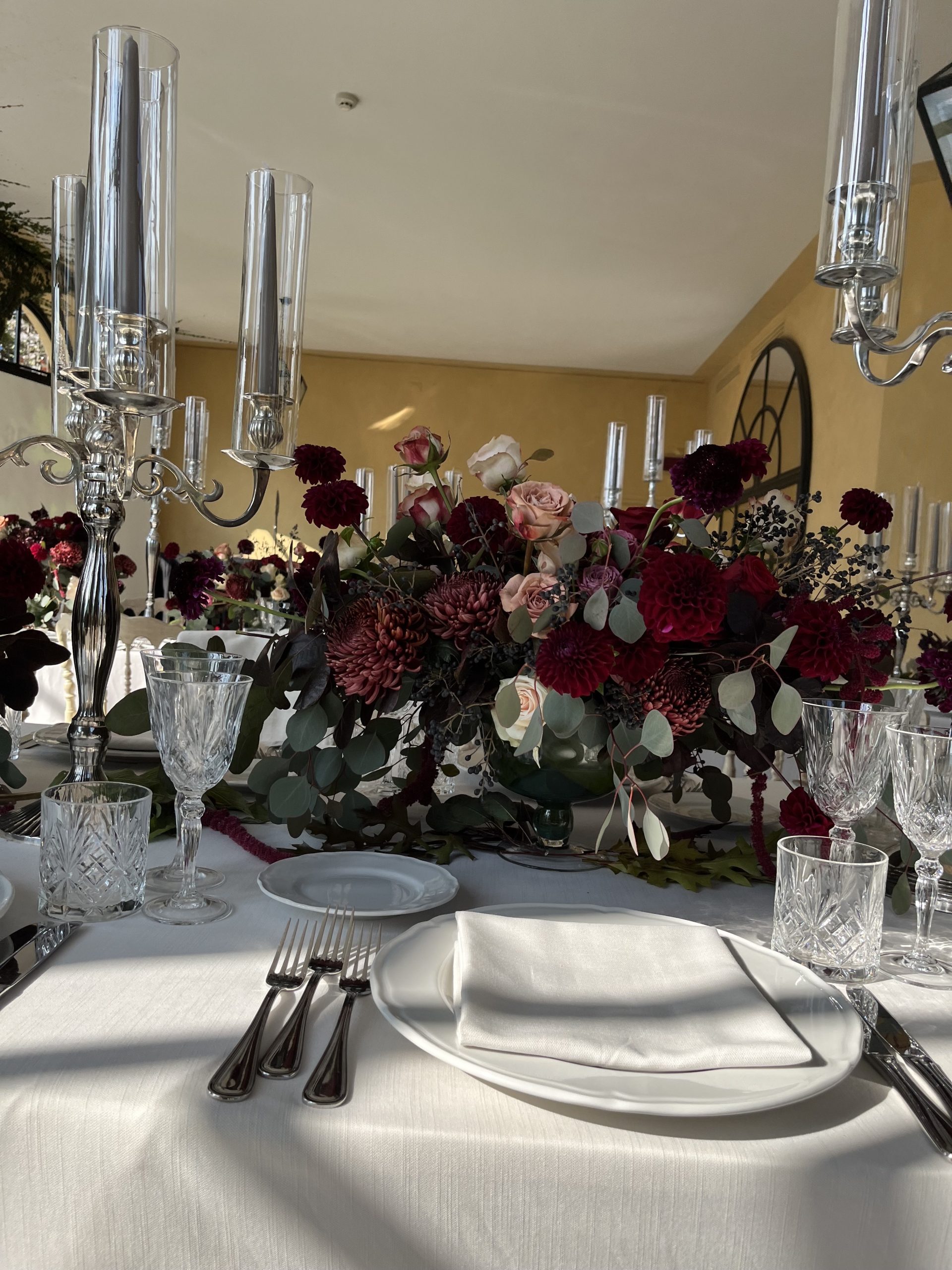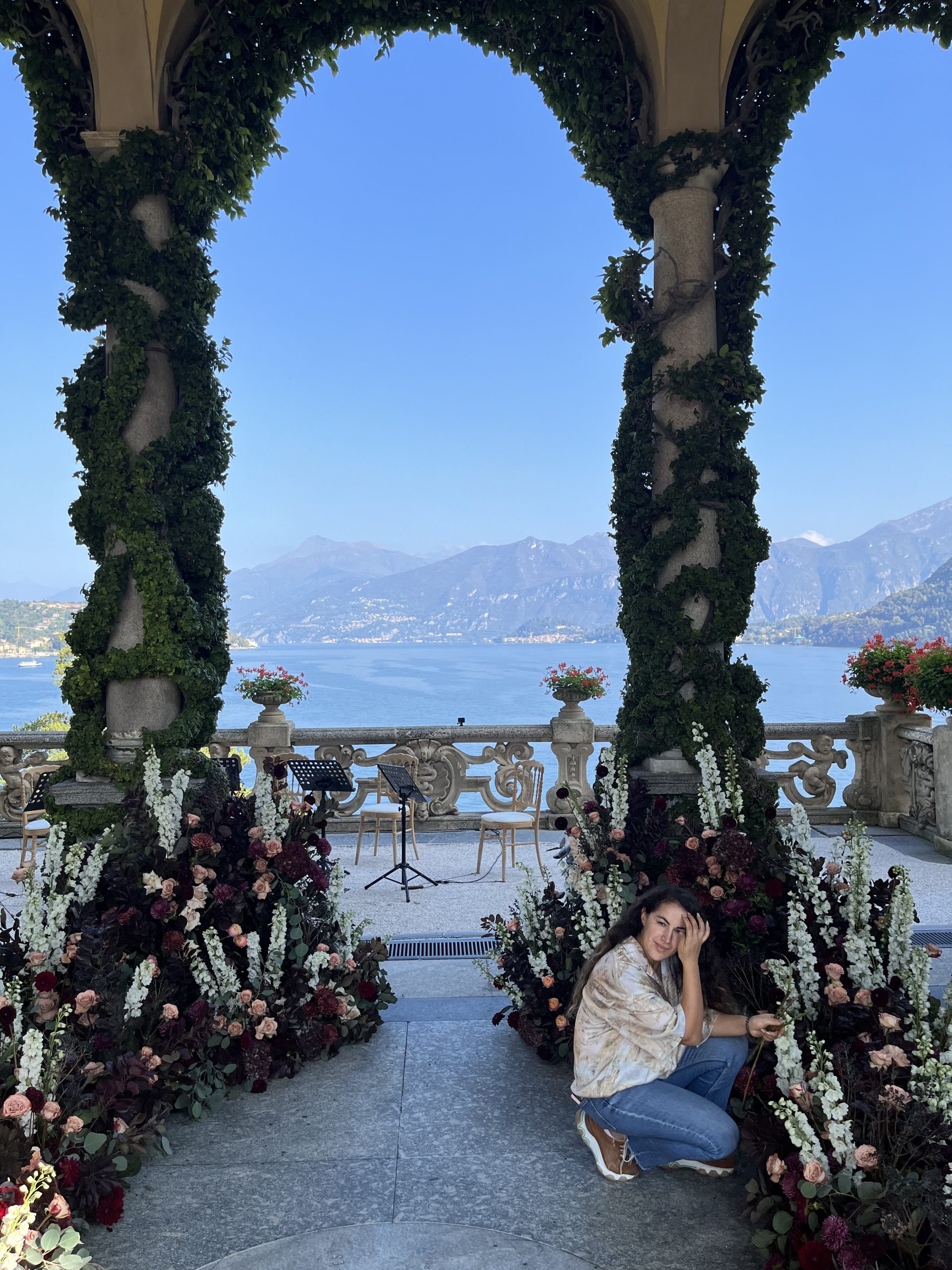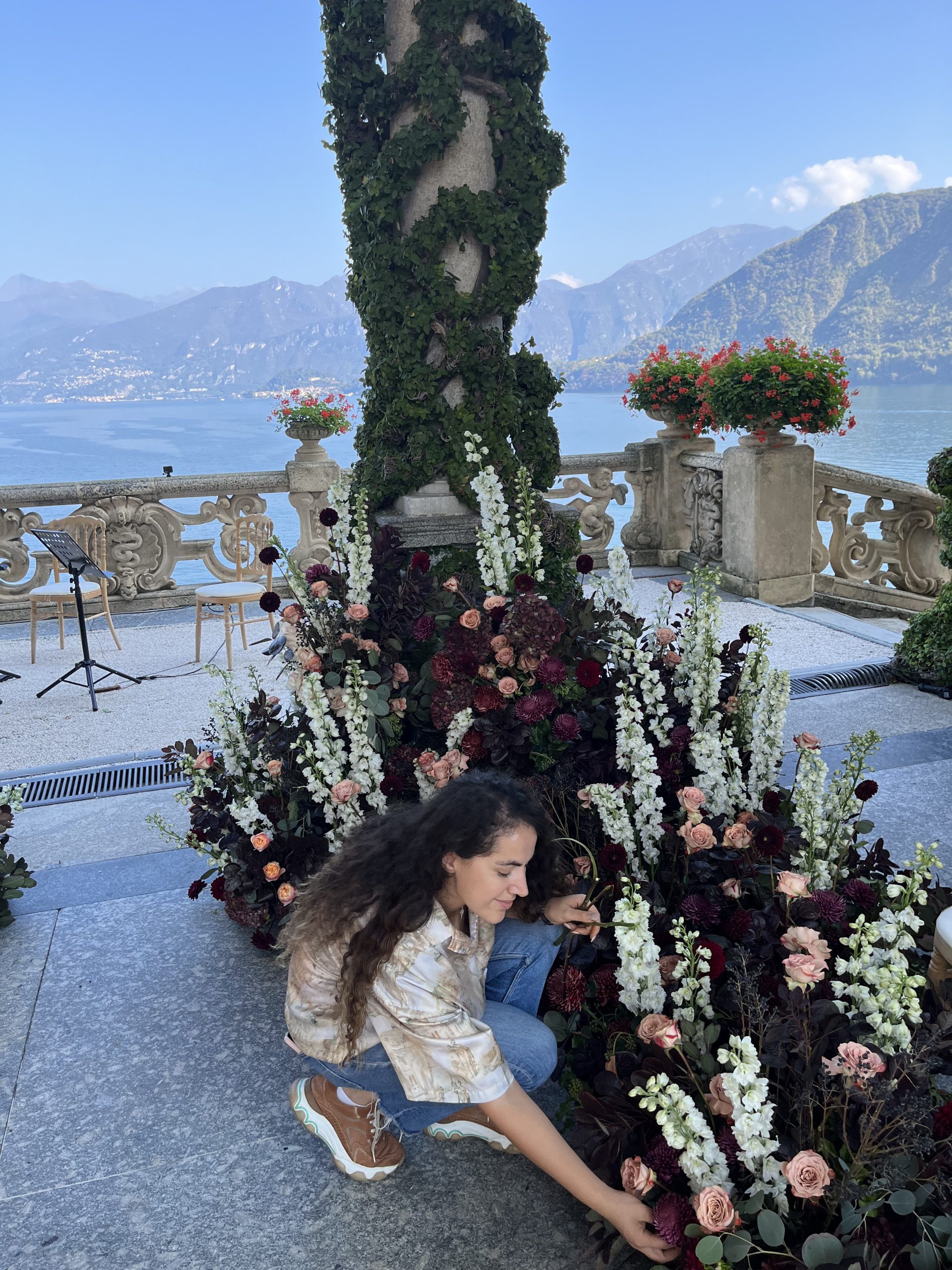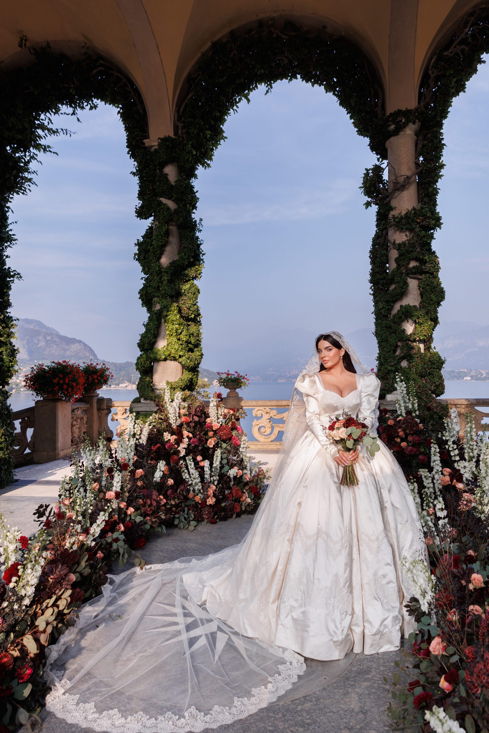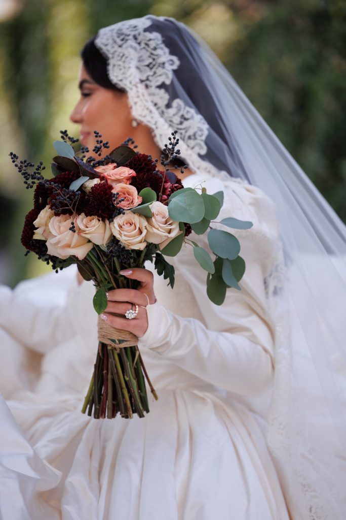 Timeless Elegance at Villa Del Balbianello – Rainy November Theme This stunning bridal bouquet, created for an event at the iconic Villa Del Balbianello with a “Rainy November” theme, perfectly reflects the essence of the season. Soft blush roses, deep burgundy blooms, and delicate eucalyptus leaves come together to evoke a sense of warmth and romance amidst the cool, dark tones of the day. Wrapped in twine, the elegant arrangement complements the bride’s timeless dress and lace veil, adding to the overall atmosphere of sophistication. The rich, moody colors of the bouquet embody love, passion, and celebration, capturing the beauty of the special occasion.