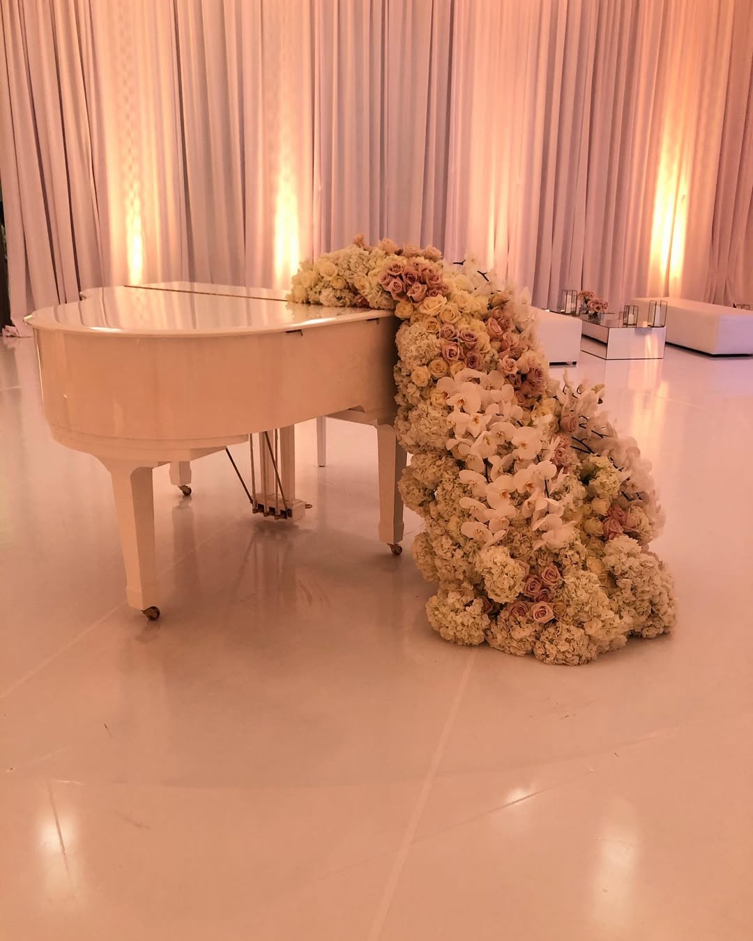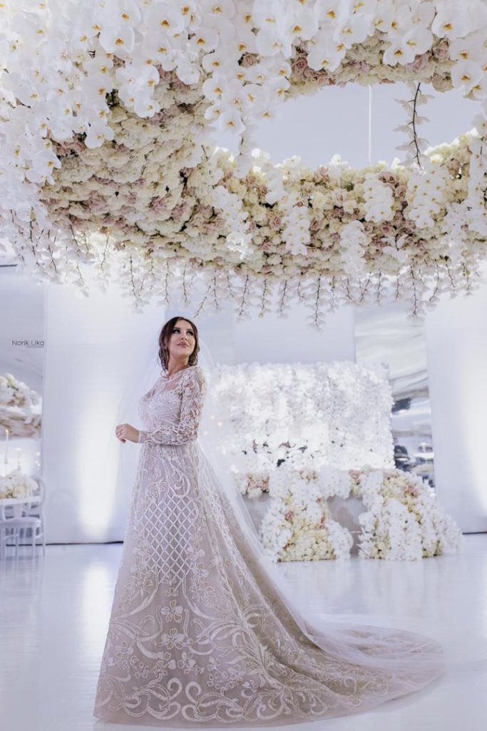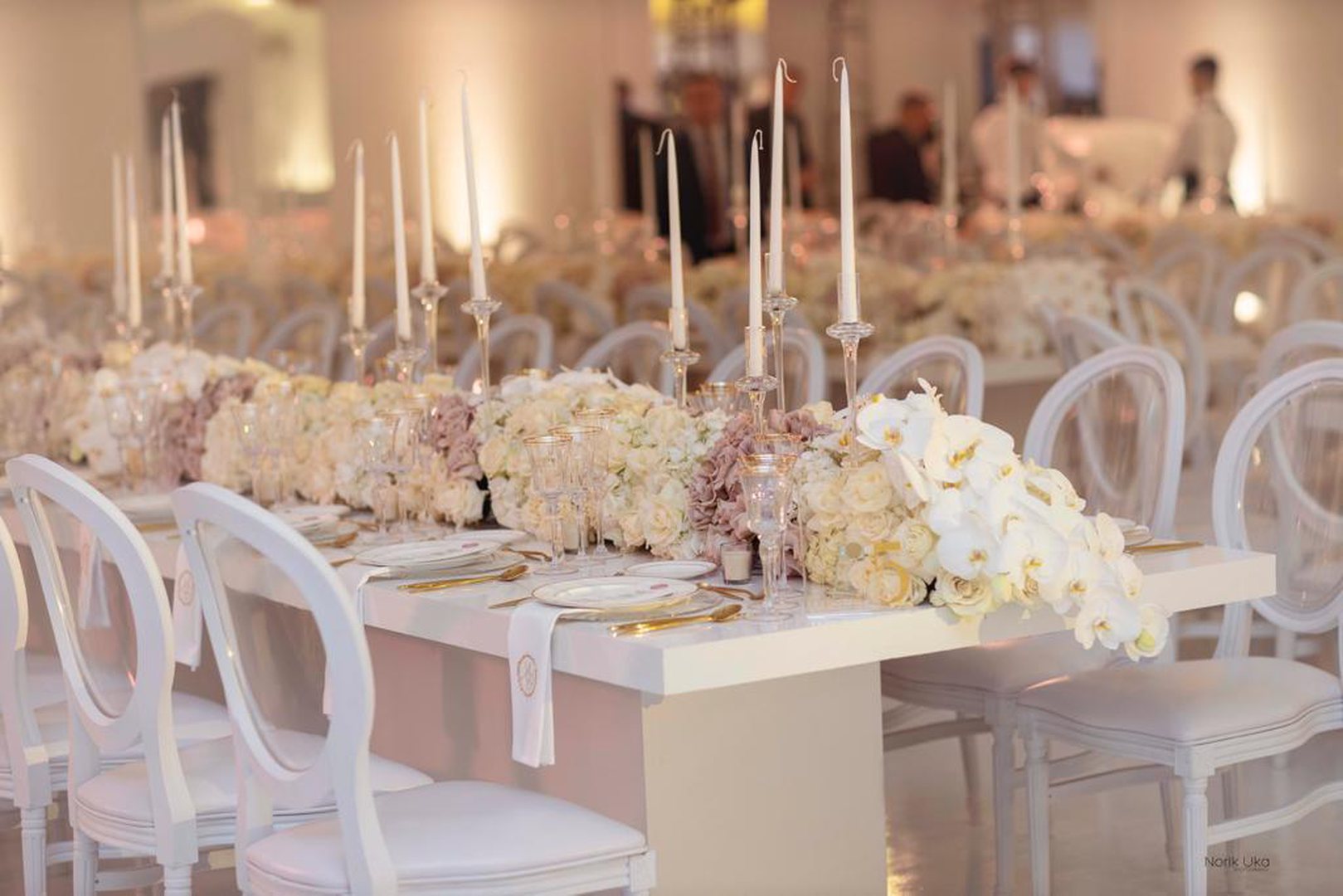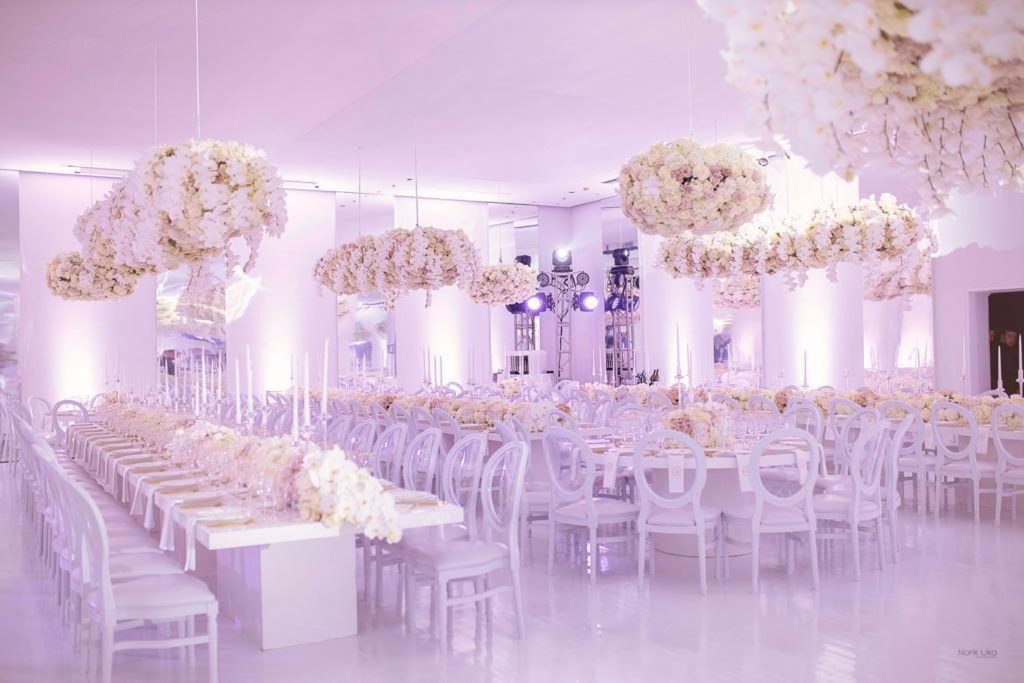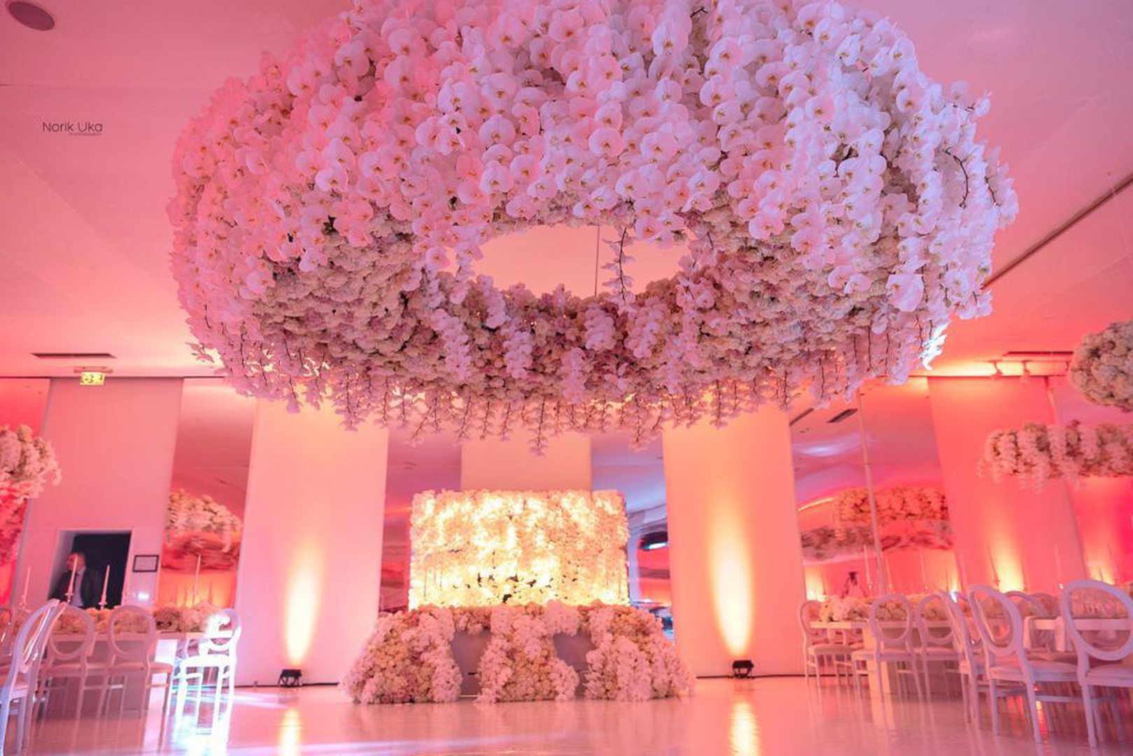 A stunning floral installation featuring cascading white orchids, creating an ethereal atmosphere of elegance and purity. This soft, cloud-like arrangement enhances the space with timeless beauty, making it perfect for upscale events. It showcases the artistry and sophistication of floristry, transforming any venue into a refined and unforgettable celebration.