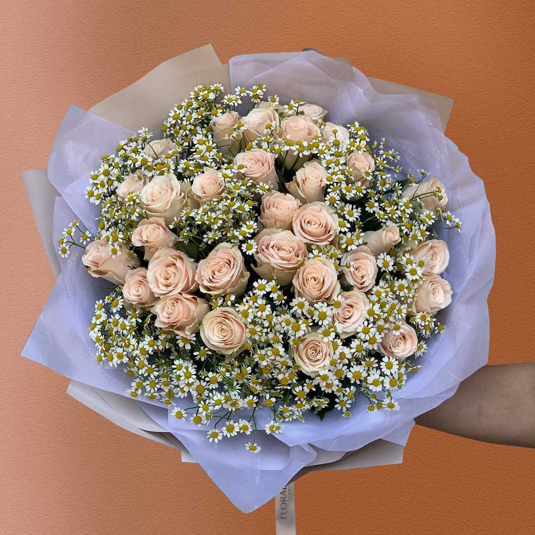 This charming bouquet features a lovely combination of soft peach roses and delicate white chamomile daisies, creating a gentle and elegant display with a touch of rustic beauty.