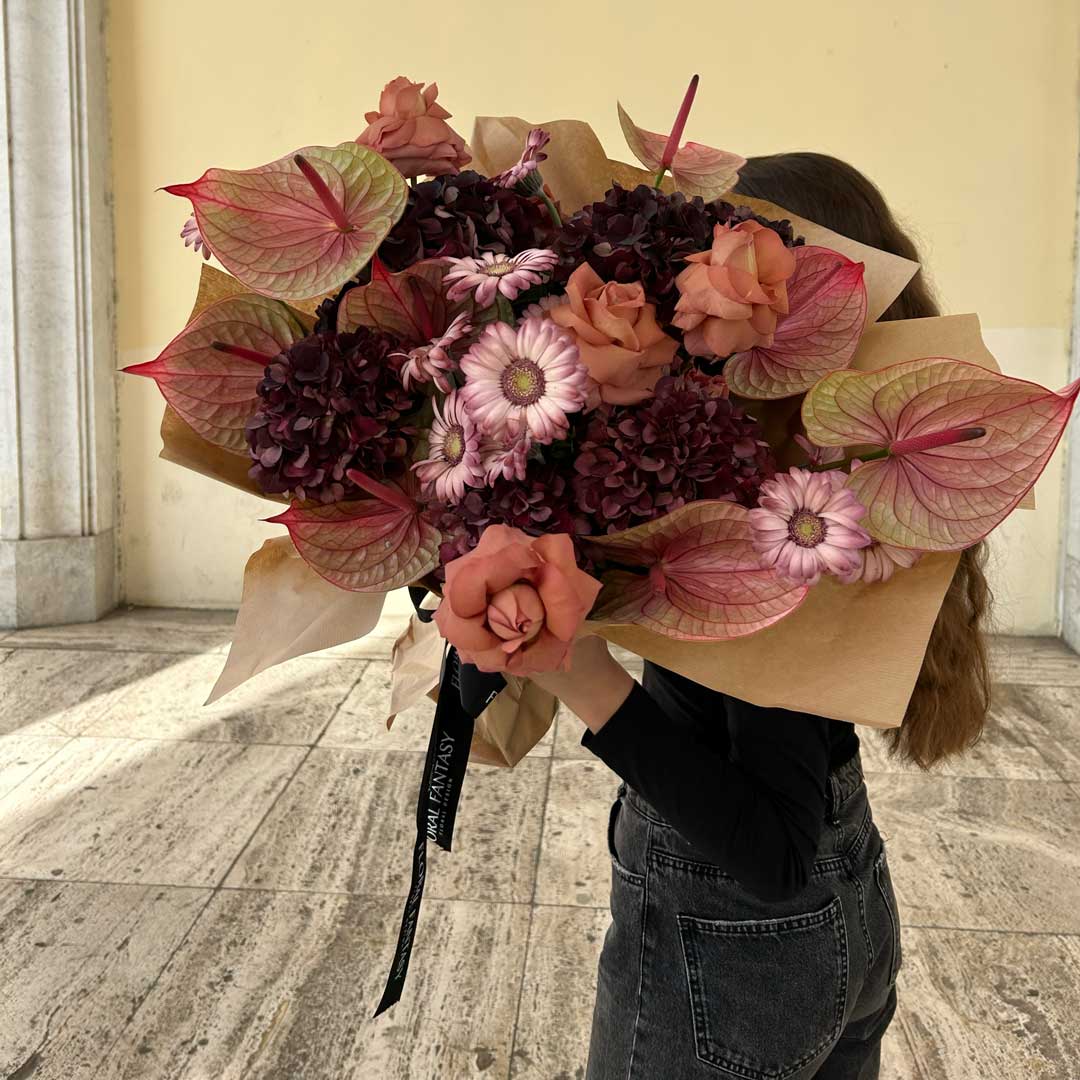 This rich bouquet showcases the unique beauty of burgundy Anthurium leaves, deep purple chrysanthemums, soft peach roses, and delicate light purple gerbera daisies, creating a captivating and textured arrangement.