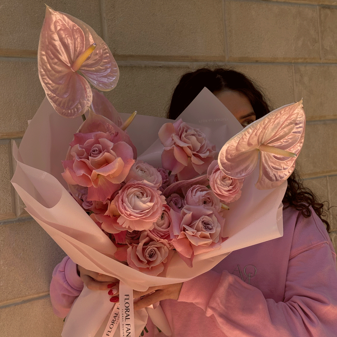 This delicate bouquet features light pink roses and striking pale pink anthurium flowers.