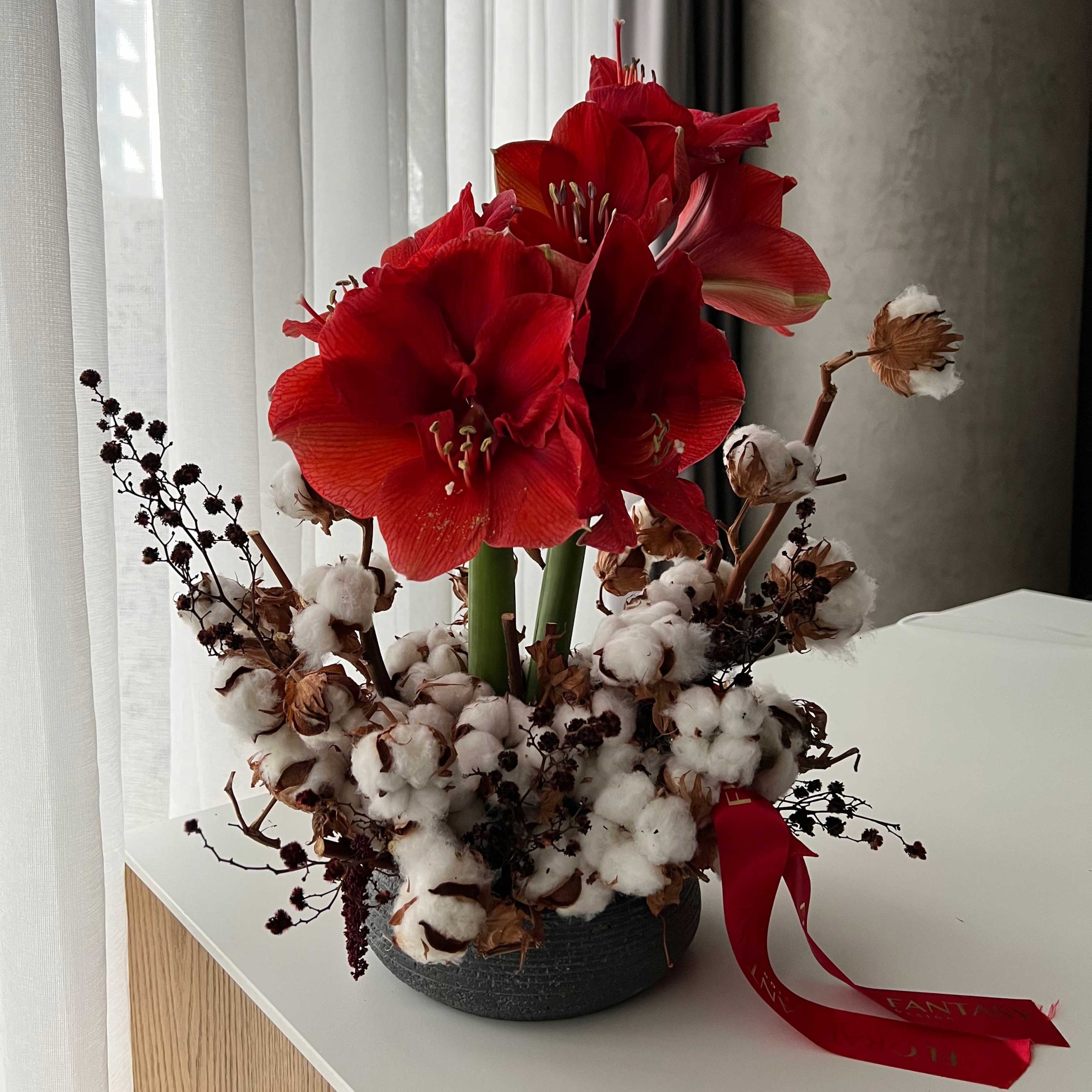 This festive arrangement features vibrant red amaryllis blooms accented with fluffy cotton stems, delicate dark branches with berries, and a red ribbon, creating a unique holiday display.