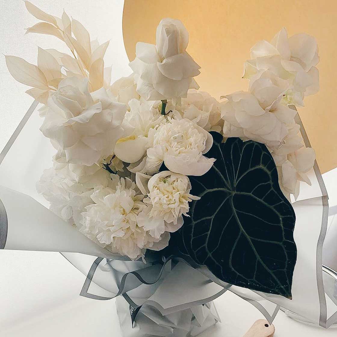 This sophisticated bouquet from Floral Fantasy in Tiranë features a stunning arrangement of white peonies, carnations, and possibly other white blooms, accented by a striking dark anthurium leaf for contrast.