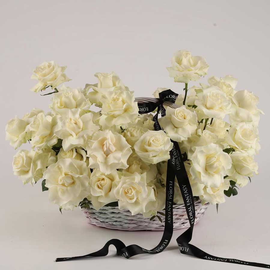 This beautiful arrangement features a generous collection of elegant white roses presented in a charming white basket, accented with a stylish black ribbon.