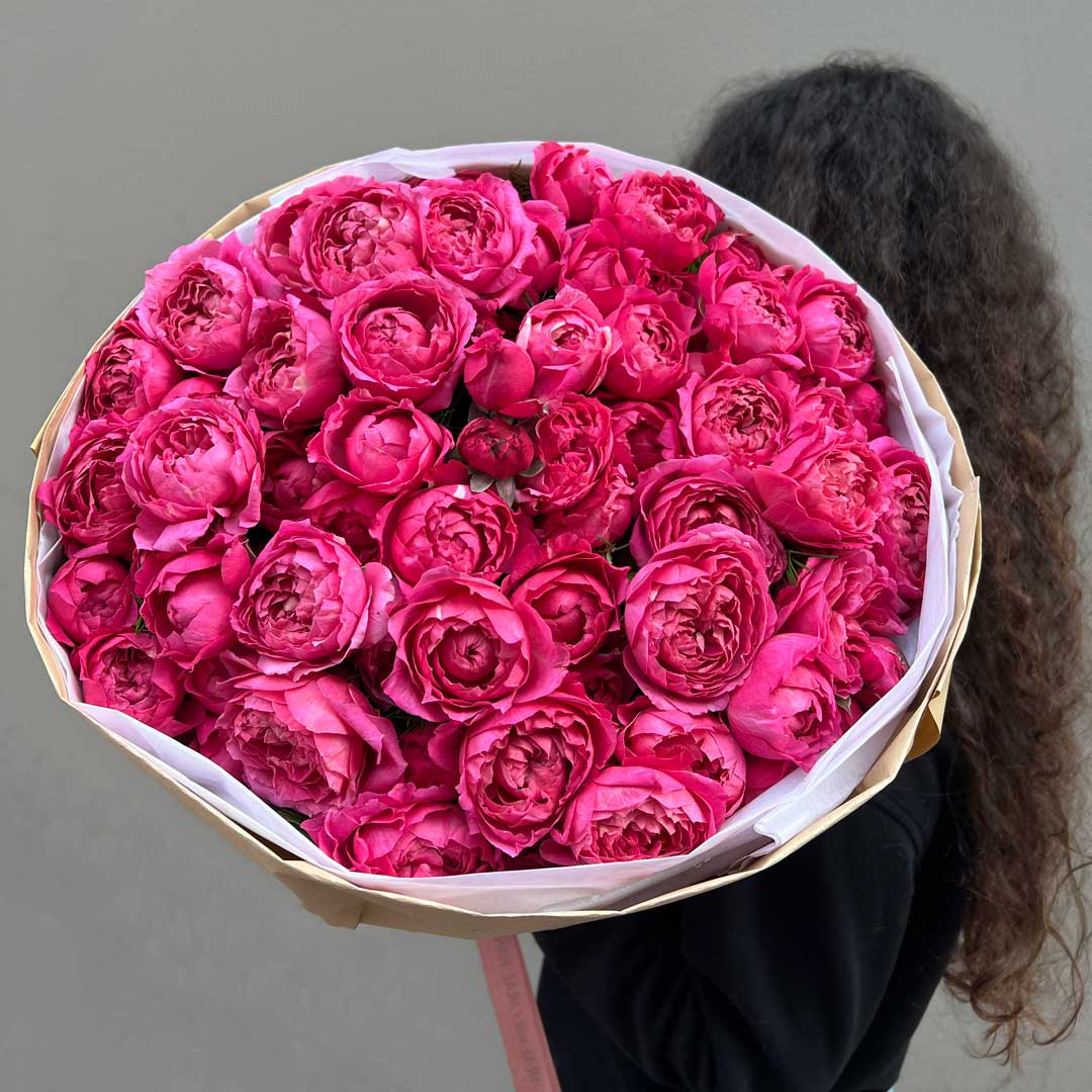 This magnificent and abundant bouquet features a stunning collection of Juliet Spray Peony Roses, known for their beautiful cupped blooms and vibrant pink color, creating a truly luxurious display.