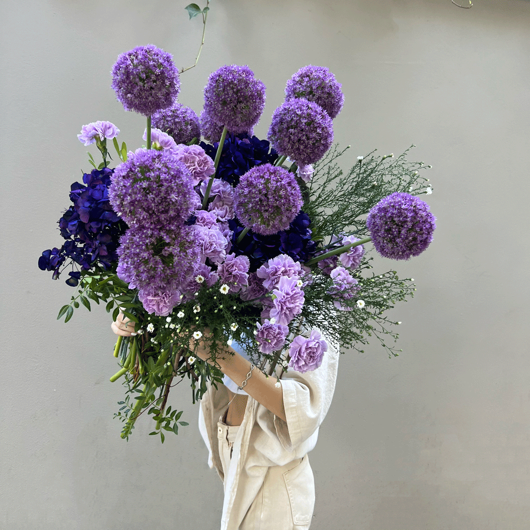 A bold and elegant bouquet with allium, carnations, hydrangeas, and delicate greenery in rich purple tones.