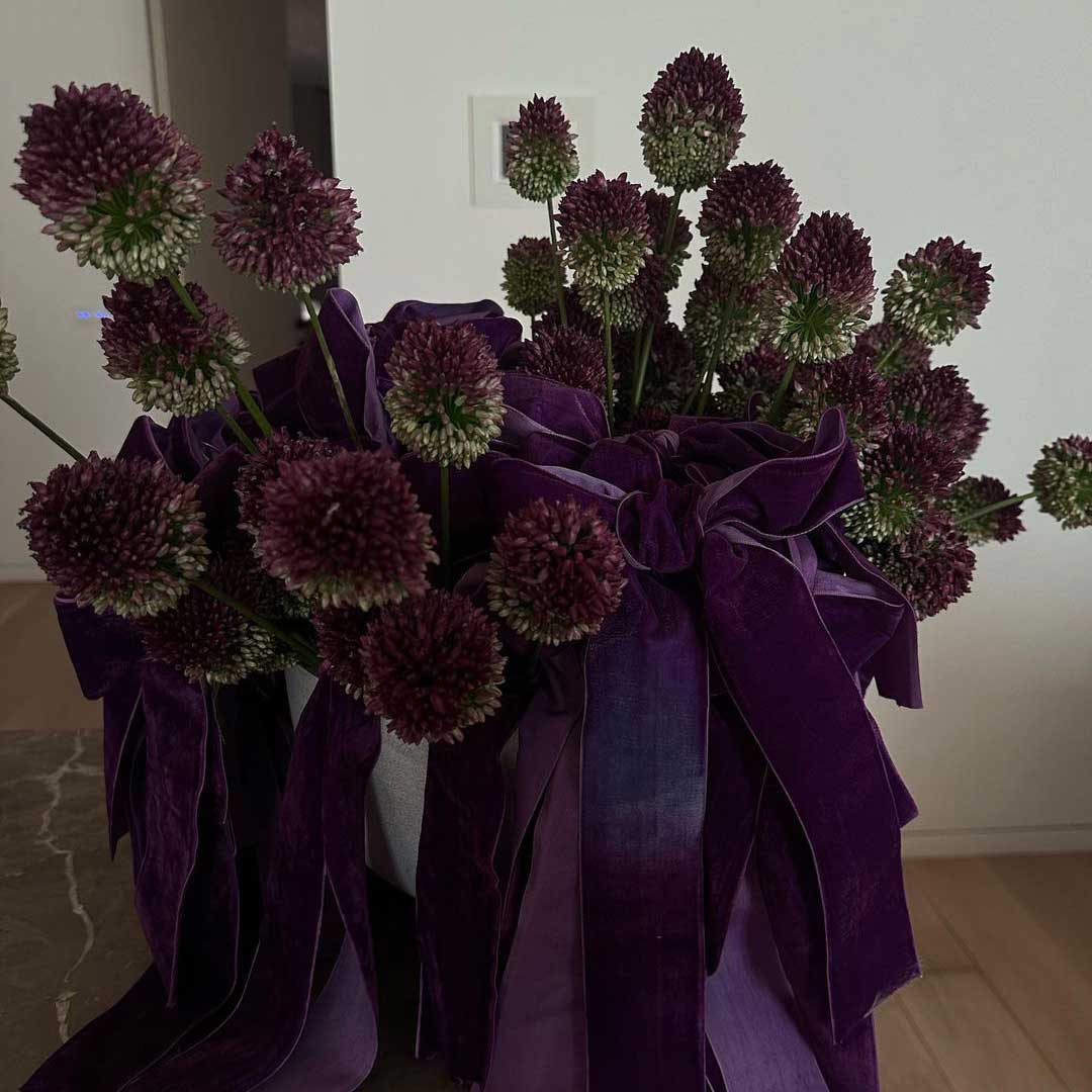 This striking arrangement features a cluster of deep purple Allium sphaerocephalon blooms, their spherical flower heads creating a unique texture, accented by rich purple velvet ribbons in a white vase