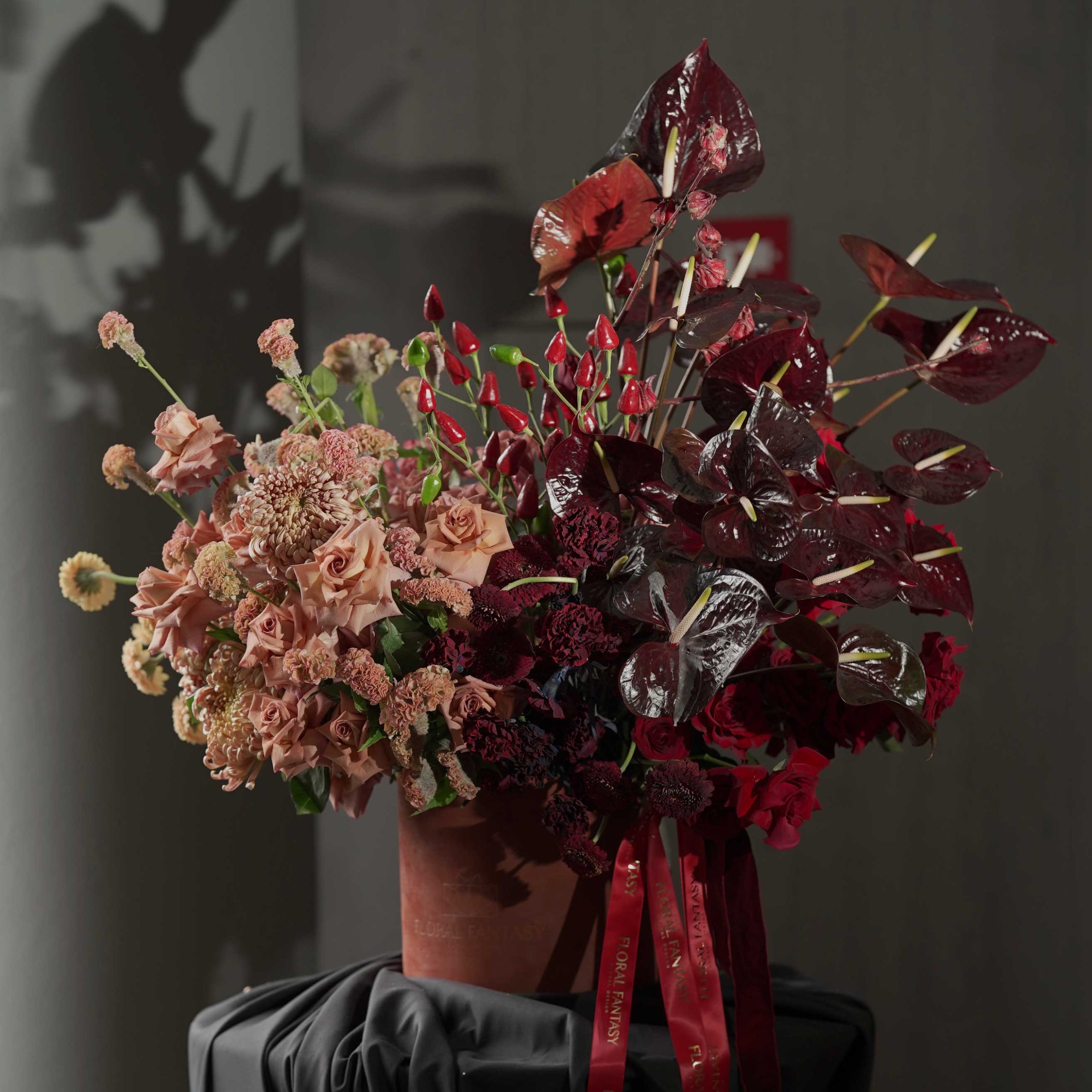 This striking arrangement features a blend of antique-toned roses, burgundy anthuriums, scabiosa, and delicate red accents in a rustic vase.