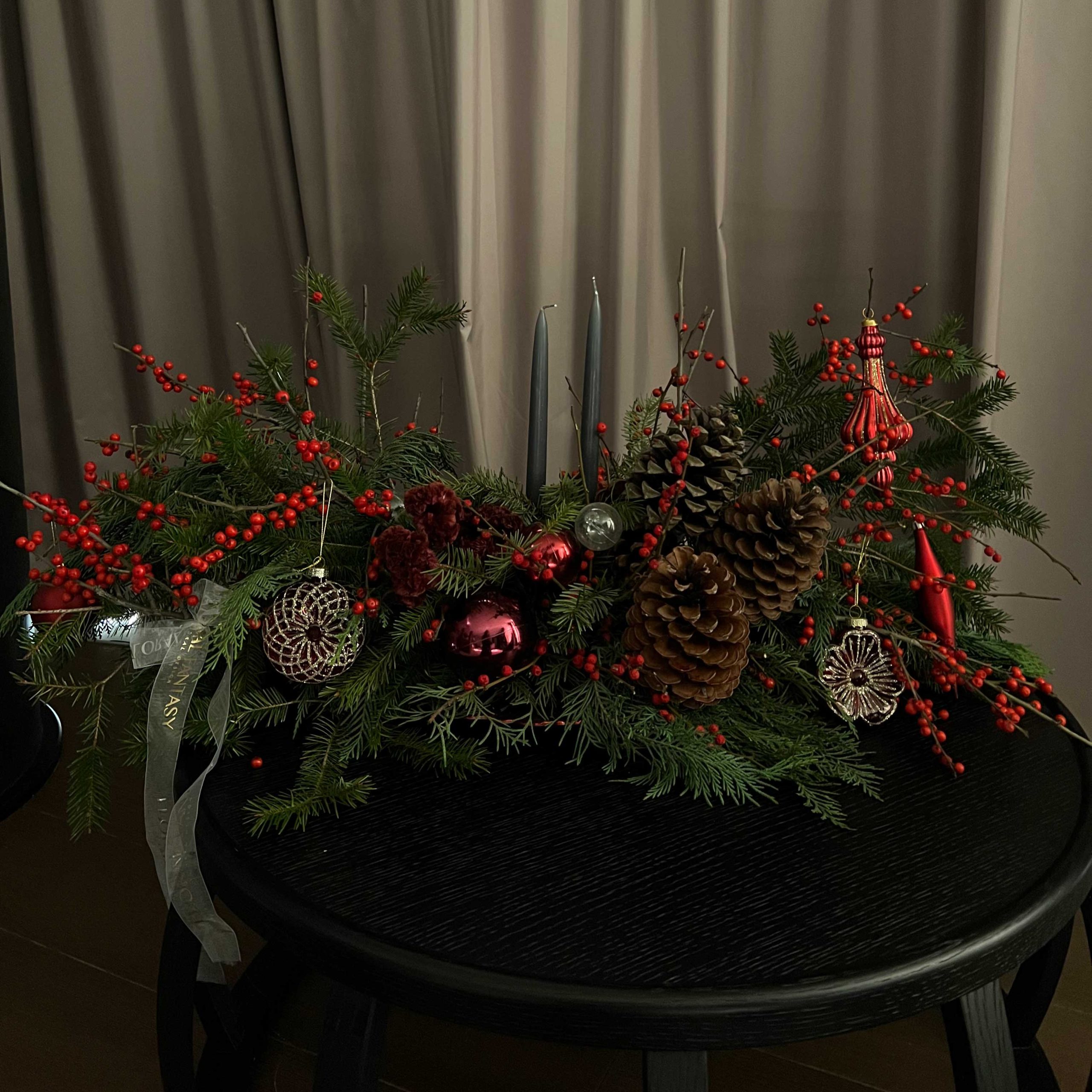 This elegant holiday centerpiece features fresh pine branches, silver-grey candles, pinecones, vibrant red berries, and shimmering silver and red ornaments, creating a sophisticated festive display.