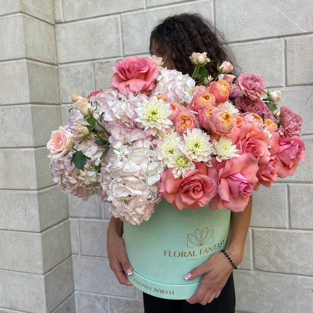 A breathtaking floral box featuring blush hydrangeas, peach garden roses, delicate spray roses, white dahlias, and soft carnations, creating a romantic and refined arrangement.