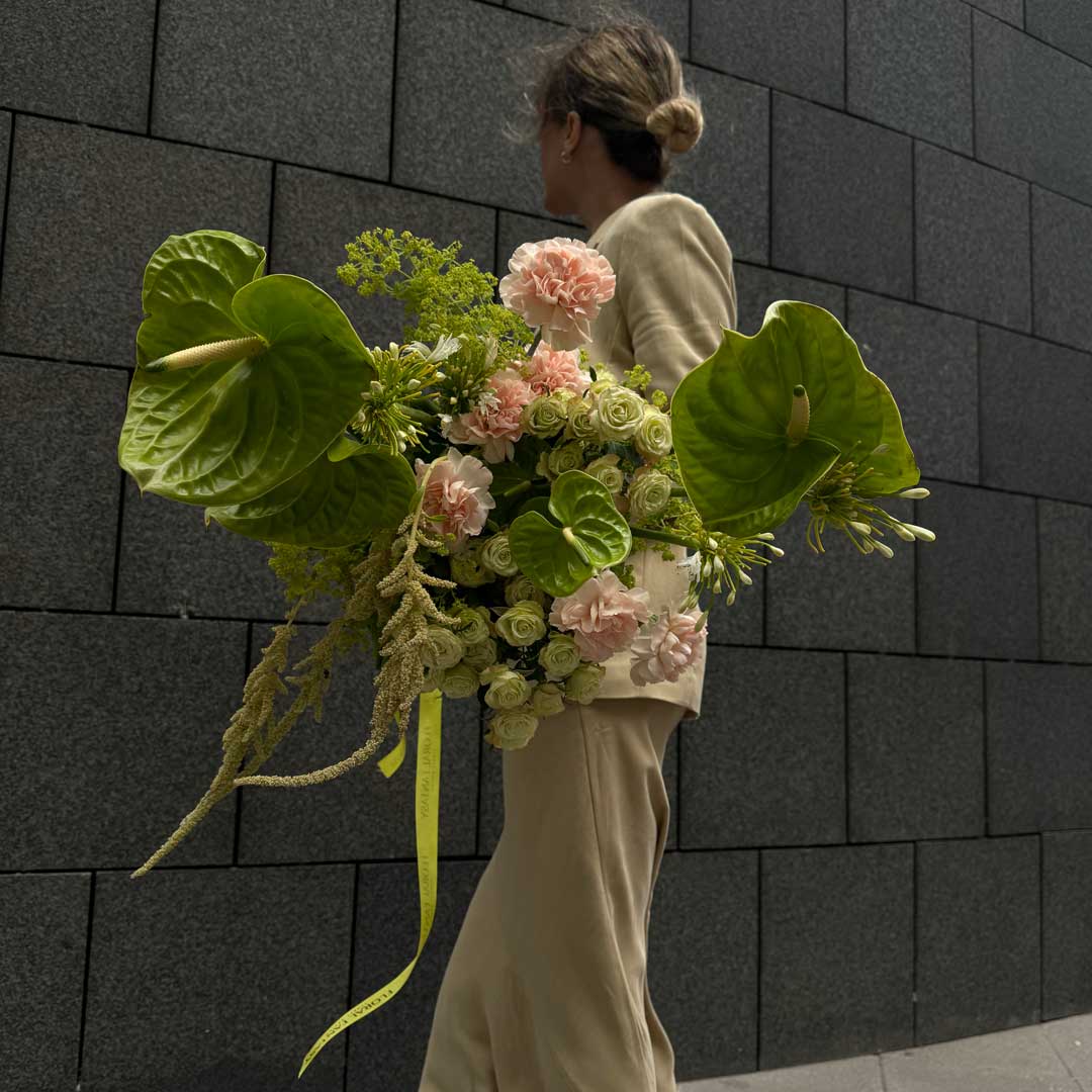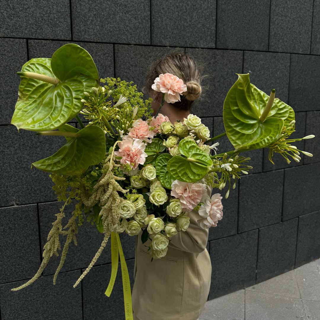 This lush bouquet features striking green Anthurium leaves, delicate light pink carnations, and numerous soft green roses, creating a harmonious and refreshing arrangement.