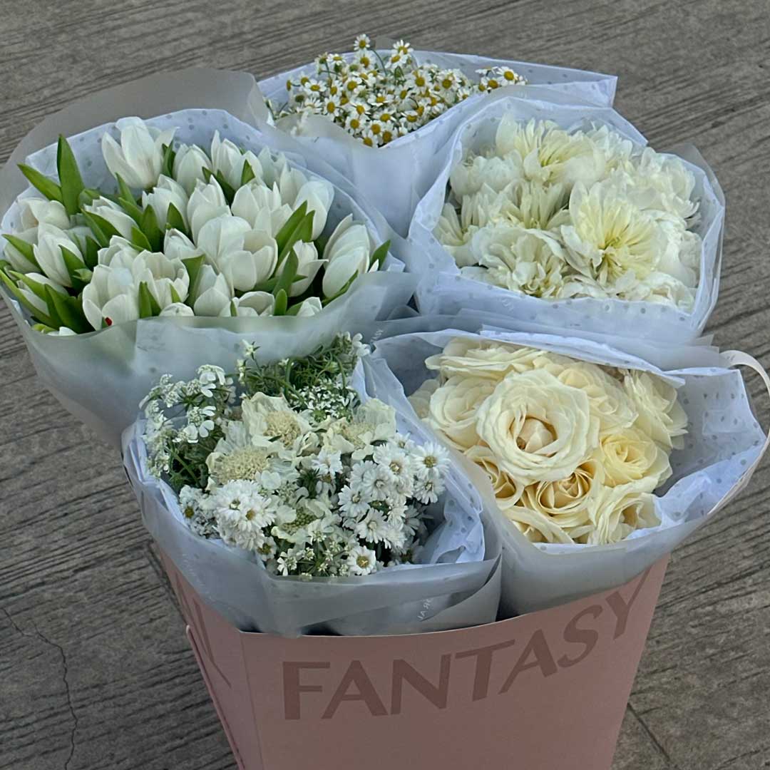 A collection of four elegant white bouquets, featuring white tulips, white chrysanthemums, white roses, and delicate white daisies with green accents, are gathered in a pink carrying container.